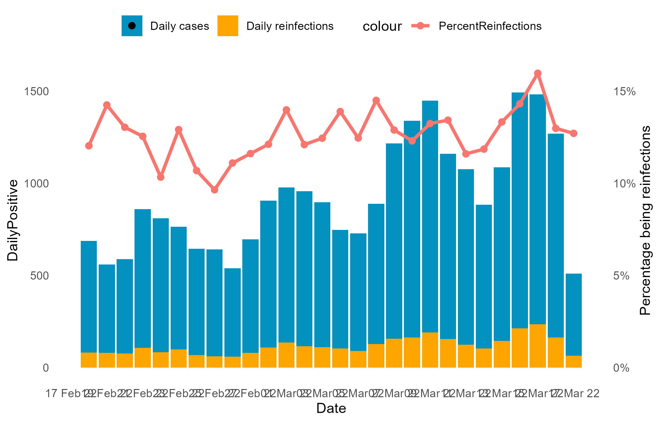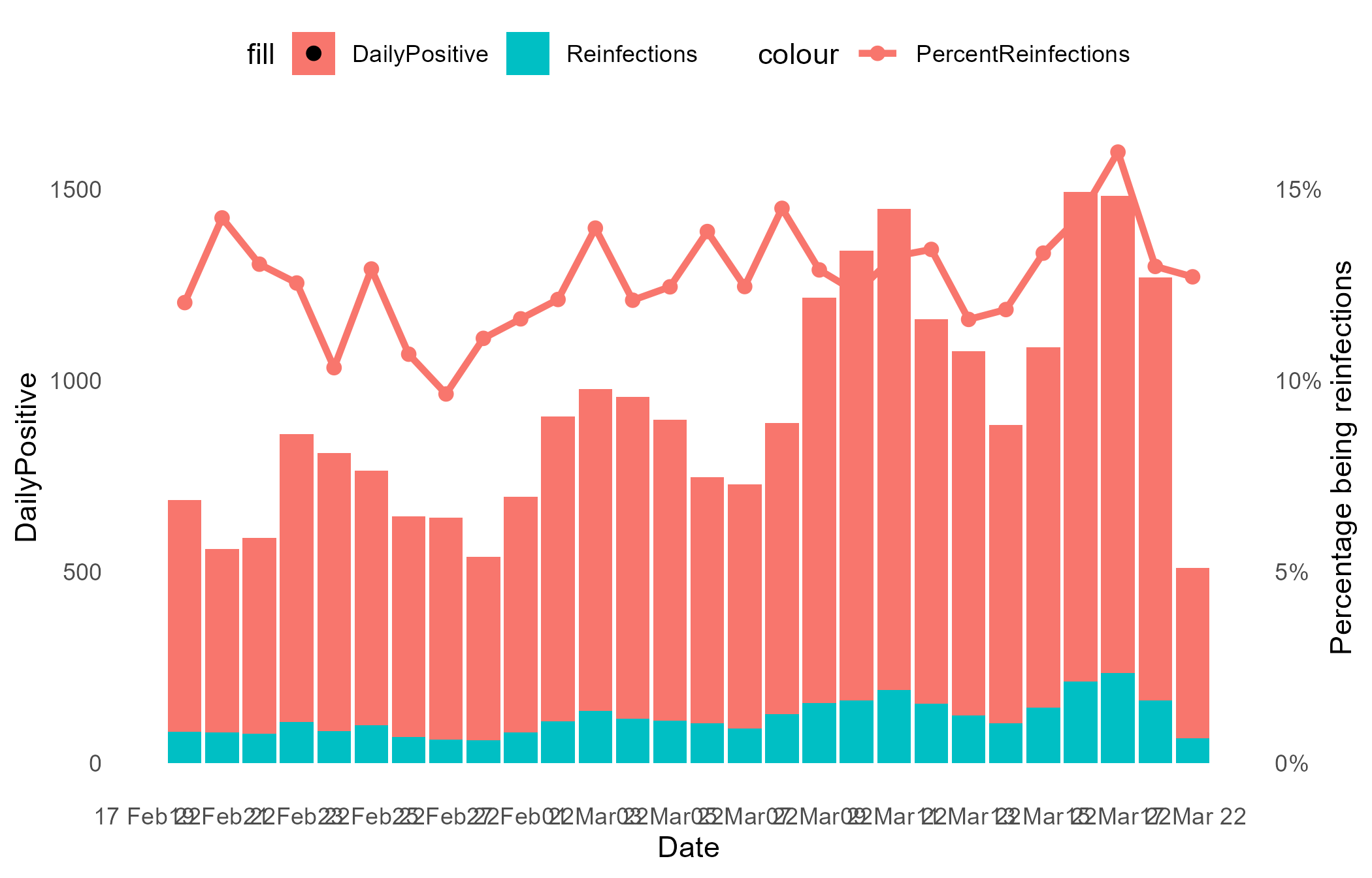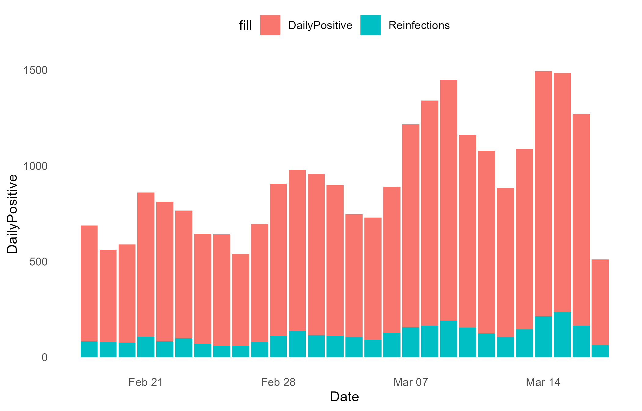 geom_col(aes(Date, Reinfections, fill = 'Reinfections')) +