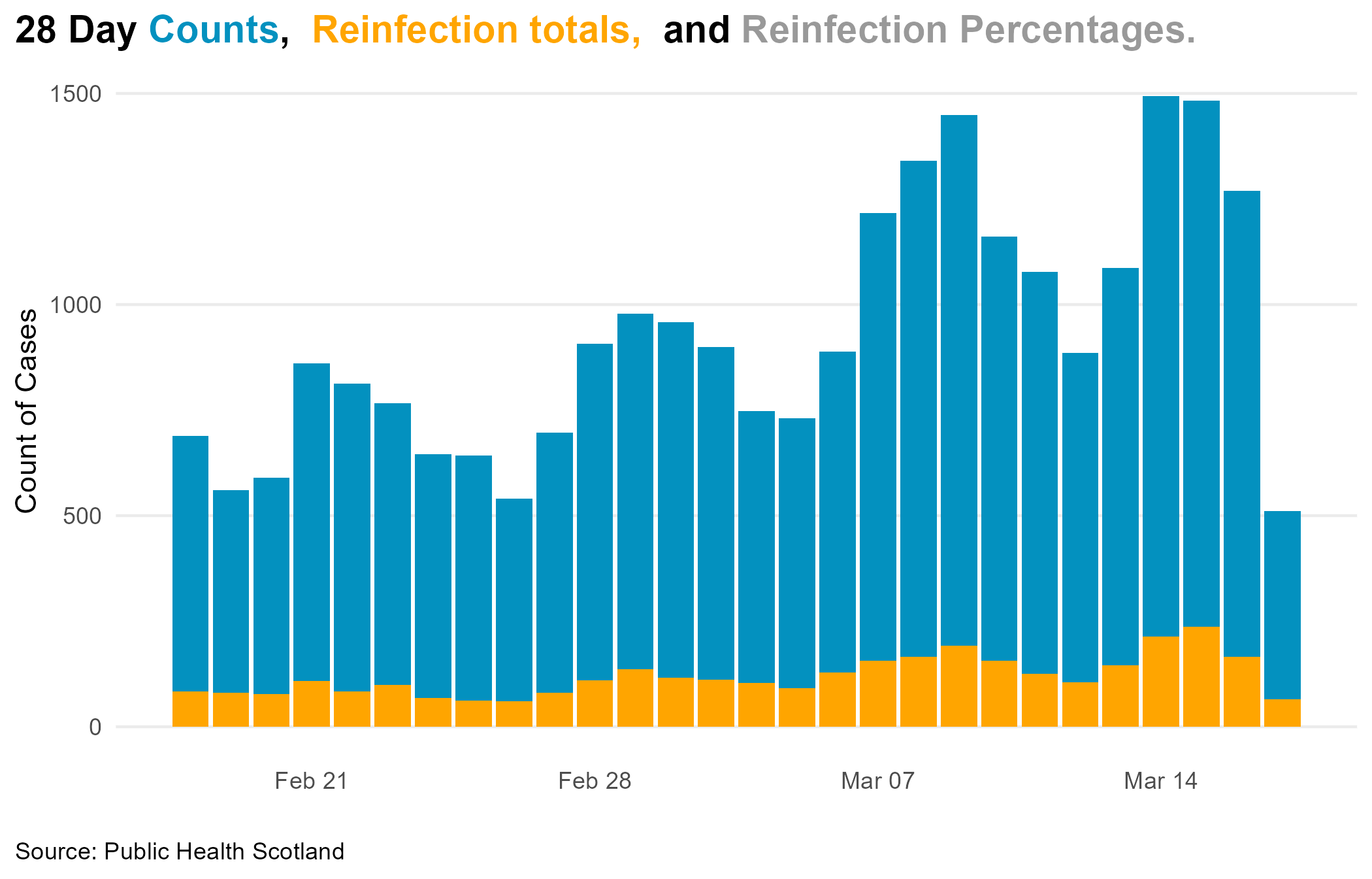<span style = 'color:#FFA500;'> Reinfection totals, </span> and