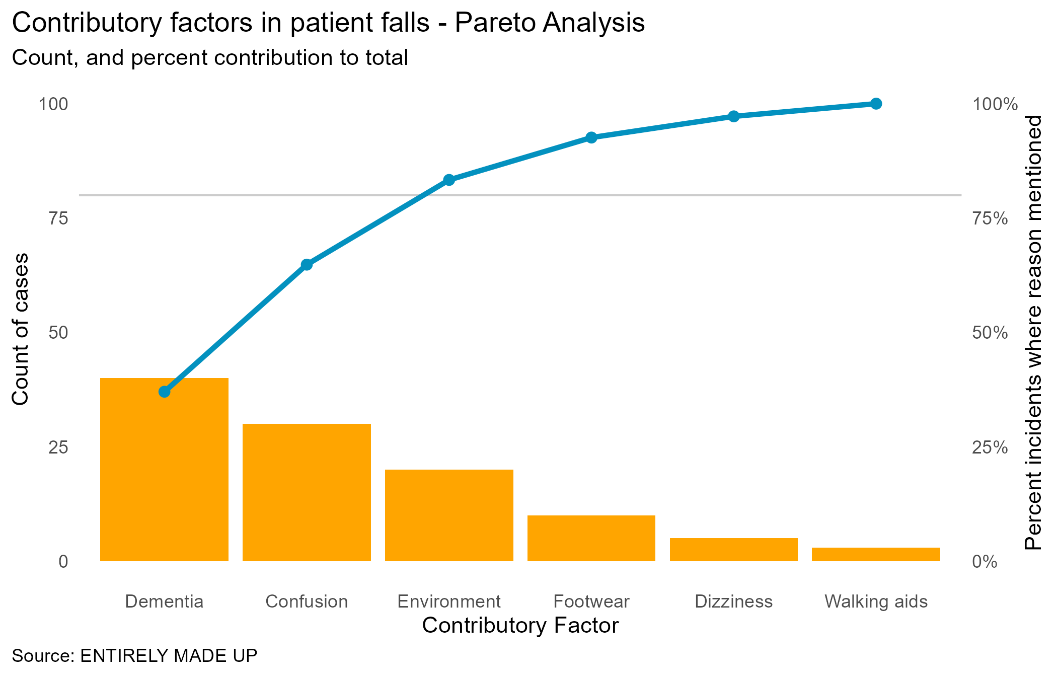 By adding the horizontal line at the 80% mark, we can see where the cutoff is for the contributory factors - the first 3 account for the bulk of the results, and so if we work on addressing these, then we might see further reductions in falls.